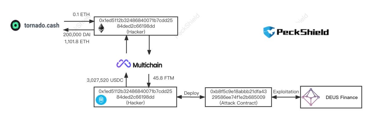 Blockchain data shows that over 3 million USDC tokens were stolen from Deus which was exchanged for 200,000 DAI and 1,101.8 ether (ETH) via decentralized exchange Multichain.