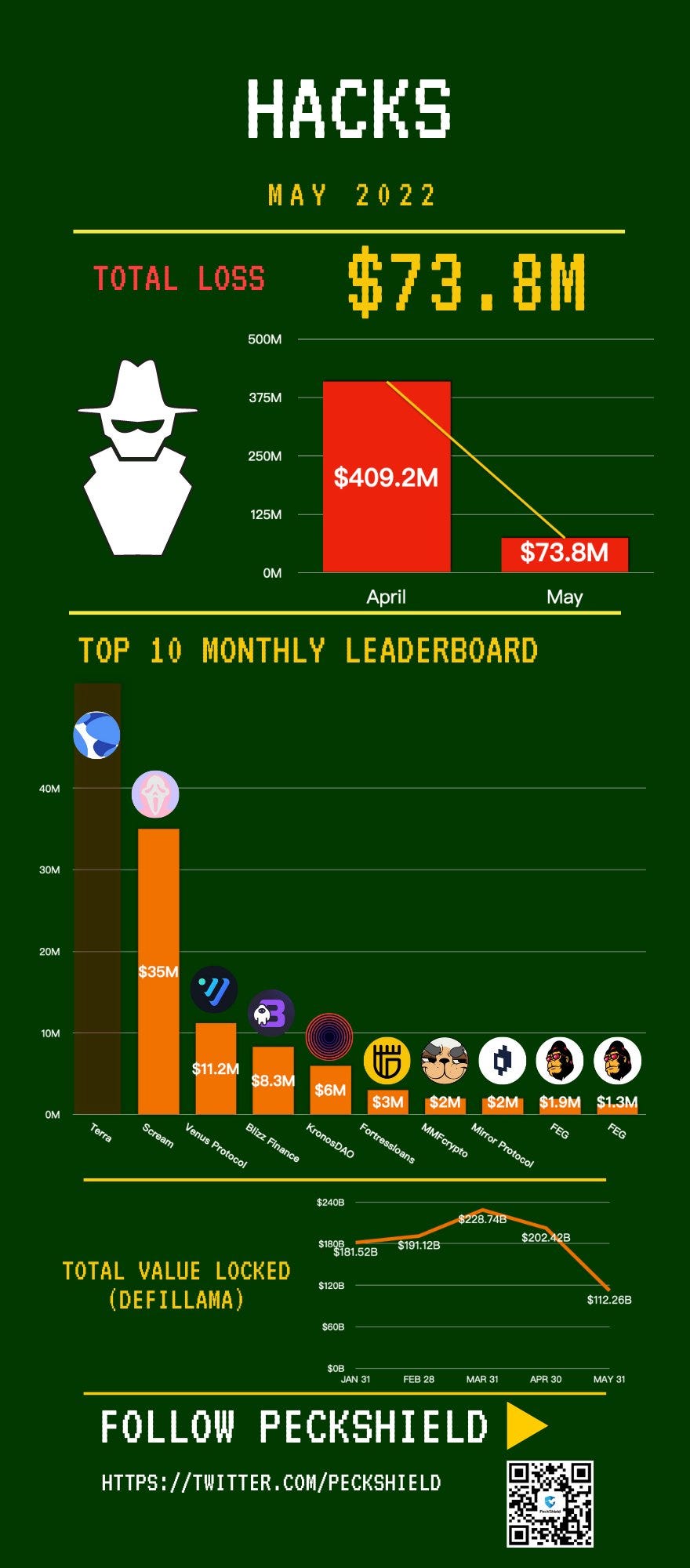 Blockchain security company PeckShield noted that there are DeFi exploits in May decreased by -82% month on month. As of May 31, TVL has dropped from ~$200b in January to ~$110b (-50%).