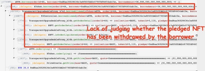 The overall logic is that the hacker first generates multiple contract addresses, then goes to call the XNFT contract, pledges the NFT, then generates an orderld, then withdraws the NFT, multiple times this operation, then calls the XToken contract’s borrow() through the previous contract address as well as the orderld In the call to borrow(), there is no judgment that the NFT has been withdrawn, so the hacker borrowed and then did not pay it back, then keeps repeating this operation.