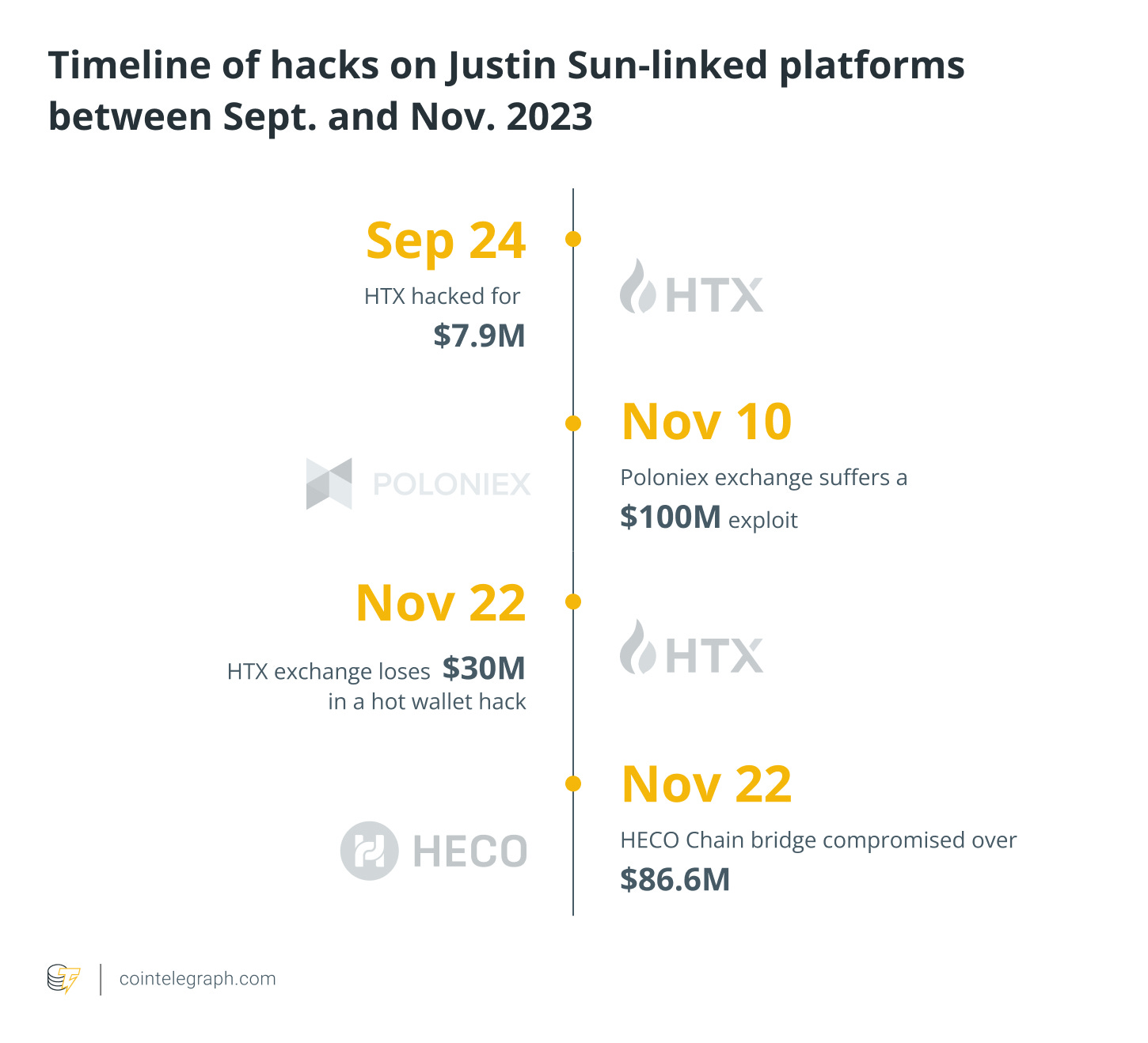 Justin Sun targeted: Tron founder Justin Sun's cryptocurrency businesses, including HTX crypto exchange and Poloniex, have been targeted by hackers in at least four attacks over the past two months. HTX was hacked twice, losing nearly $8 million in the first attack and $30 million in the second. Poloniex, owned by Sun since 2019, suffered a significant breach with attackers stealing at least $100 million in cryptocurrency. The incidents raise concerns about the security of Sun's crypto ventures [more]